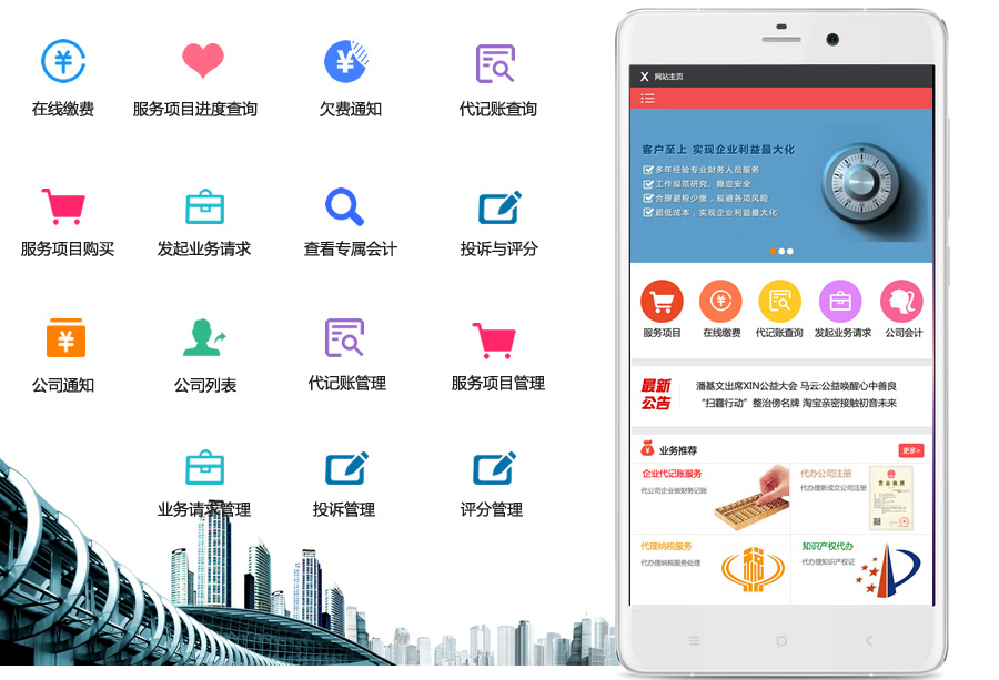 四、与客户互动沟通性强:支持客户评价会计员(员工)、投诉员工、员工和管理员可发通知催缴欠费(给欠费企业客户),客户可发起非收费性服务业务请求等等这些都结合上模板消息或者短信通知。