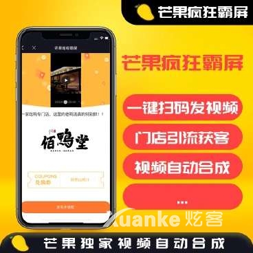 芒果疯狂霸屏是通过M音开放平台接口,实现末端客户扫码,实现一键转发商家设置好的M音视频,帮助商家低成本引流拓客系统,是一款借力于抖音平台与商户拓客相互融合的新型产品。程序简单易懂,上手快,商户接受度高,末端客户操作简单。为商家实现门店精准拓客引流。