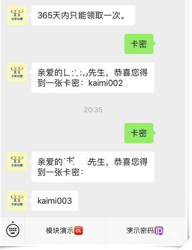 支持卡号密码模式,用户进入卡密模式后,再次发送卡号,自动回复给用户卡号对应的密码