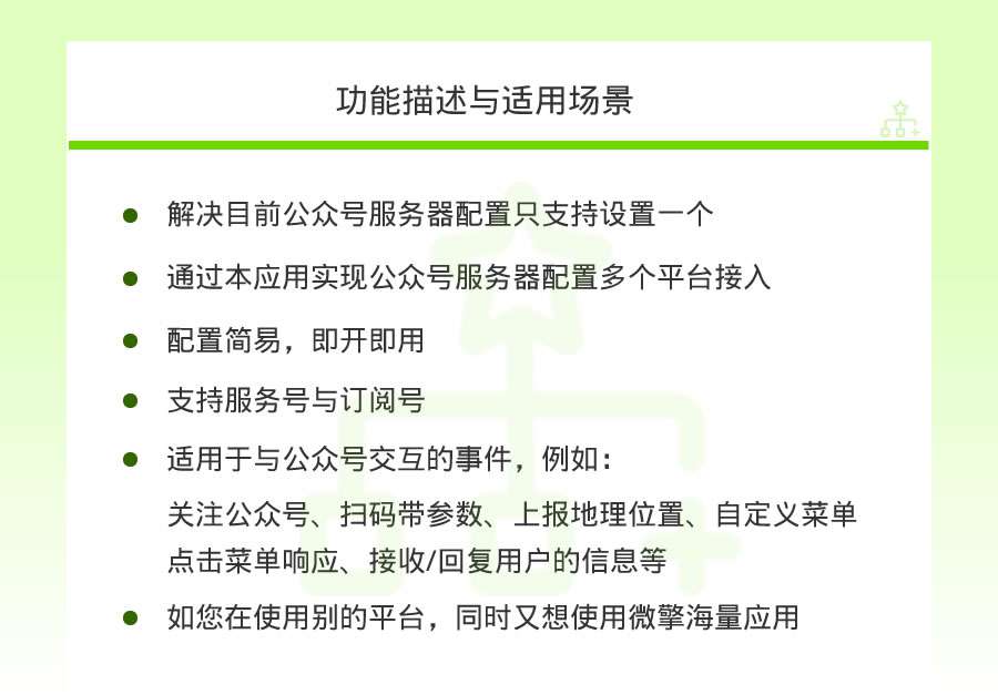 目前微信公众号服务器配置只允许配置一个服务器地址,通过本应用可以无限配置多个服务器地址,实现多个平台同时使用一个微信公众号。