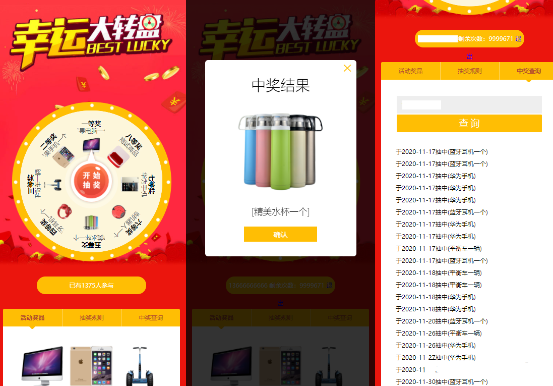1.后台可以设置每个抽奖用户的抽奖次数,设置奖品,适和企业和商场搞活动,先注册,才能抽奖;每个手机号码和 IP,都可以 限制抽奖次数。