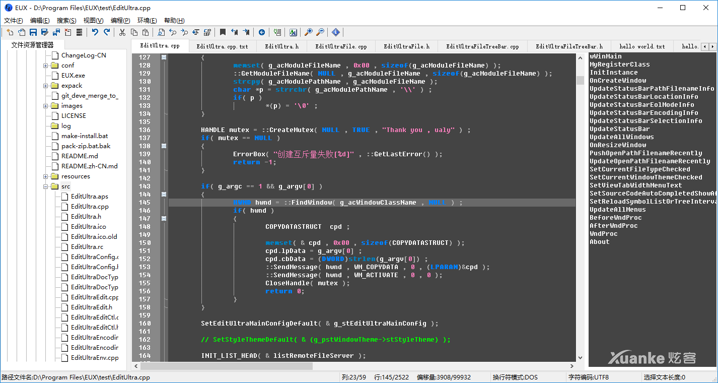 EUX是一款性能卓越的文本/源码编辑器(内嵌数据库客户端功能和Redis客户端功能)。它基于开源的富文本编辑控件Scintilla,自研大量功能,构建出一套完整的文本/源码文件编辑软件,覆盖日常生活工作和源代码编写基本功能,此外EUX还能直接提交文本文件里的SQL发给数据库,直接提交Redis命令给Redis服务端。整个软件只有10MB(不包含数据库客户端库),小巧但文本编辑功能完整,且性能卓越,几乎秒开文件,不像VS或VSCODE总是慢半拍。