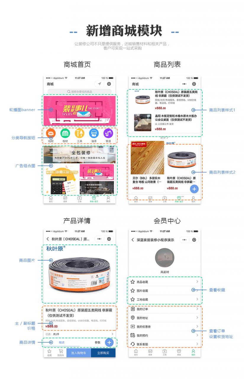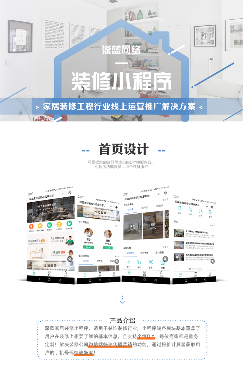 深蓝家居装修小程序一般用于装修装饰行业,适用于装修装饰公司!可以通过小程序进行案例展示,文章内容吸引流量,通过报价小程序获取用户手机号码!可以创建多个小程序,没有任何限制!!!小程序是一种不需要下载安装即可使用的应用,它实现了应用“触手可及”的梦想,用户扫一扫或者搜一下即可打开应用。也体现了“用完即走”的理念,用户不用关心是否安装太多应用的问题。应用将无处不在,随时可用,但又无需安装卸载。