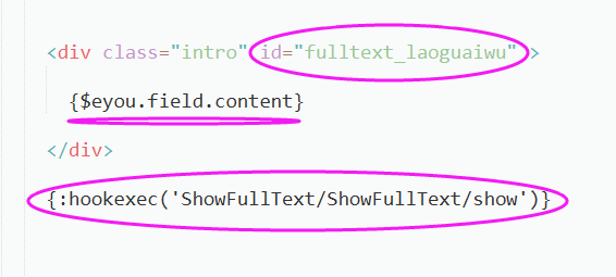 第二个代码:{:hookexec(‘ShowFullText/ShowFullText/show’)}