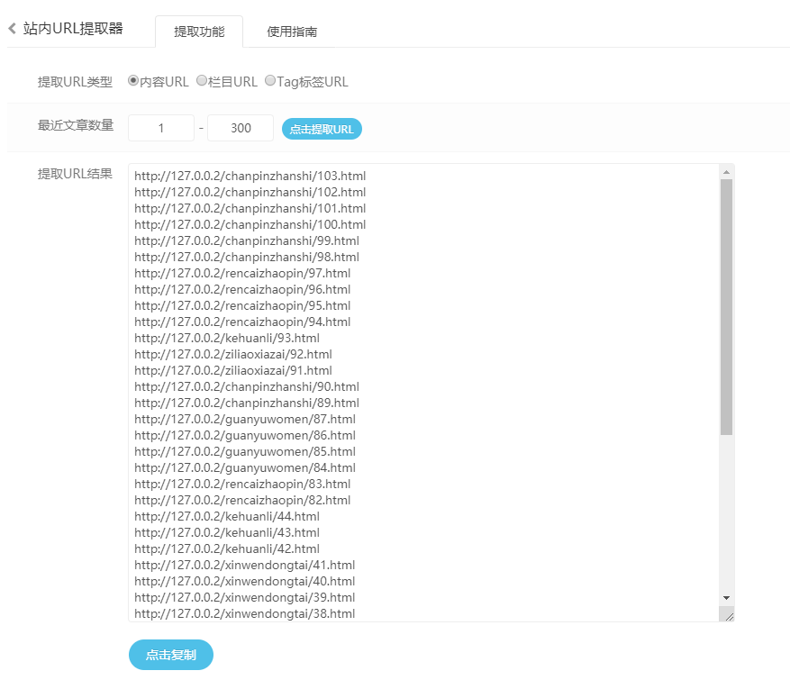 用途: 有些站长使用的站群工具,或者搜索引擎的批量提交工具,需要提取网站的文章url,所以给大家写了一个。